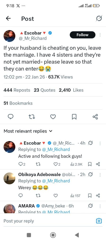 He wrote: “If your husband is cheating on you, leave the marriage. I have 4 sisters and they’re not yet married — please leave so that they can enter.”