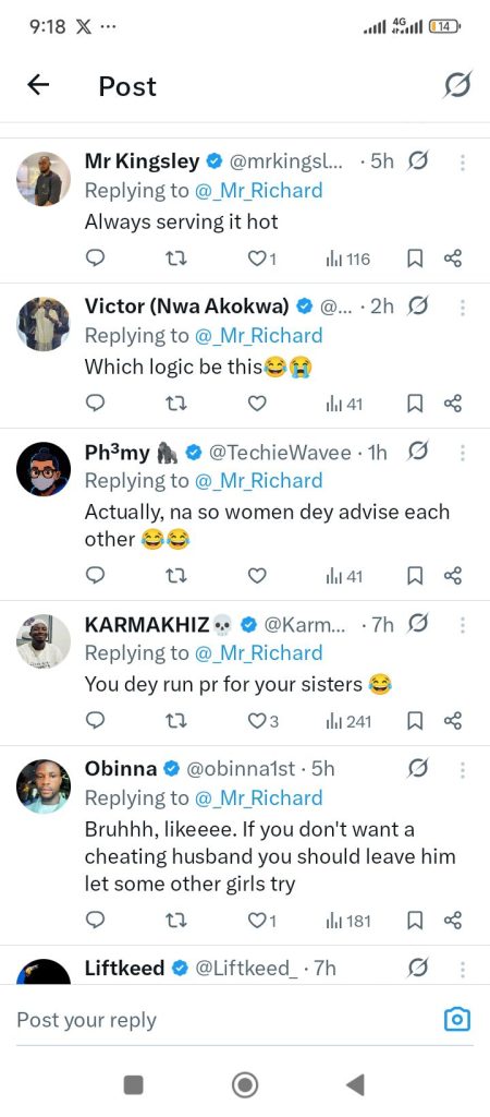 Others seemed to support the idea, even if jokingly. Obinna wrote: “Bruhhh, likeeee. If you don’t want a cheating husband you should leave him let some other girls try.”