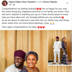 A Nigerian woman, Hajara Edeje Umar Husseini has congratulated her husband, Umoru Yakubu Umar, as he sets to marry a new wife.