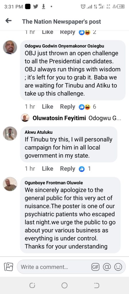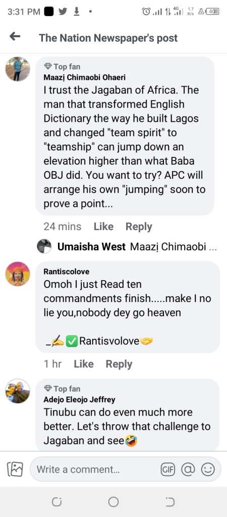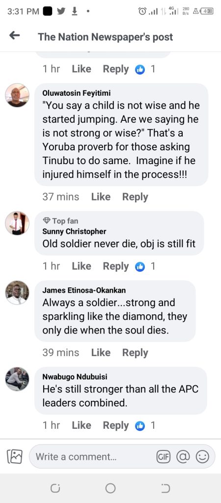 Tell baba OBJ that he’s no more a small boy ooo. Looking at his landing, you will observed his knees bend. I observed that his legs can’t support his body weight. Jeje leegun agba njo. (The old masquerade should learn how to dance jently).