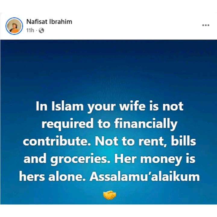“In Islam your wife is not required to financially contribute. Not to rent, bills and groceries. Her money is hers alone. Assalamu’alaikum,” she wrote in a Facebook post on Monday, January 5.
