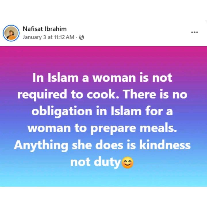 “In Islam a woman is not required to cook. There is no obligation in Islam for a woman to prepare meals. Anything she does is kindness not duty,” she stated earlier.