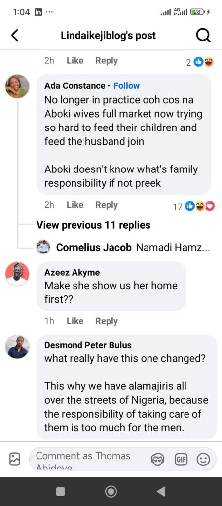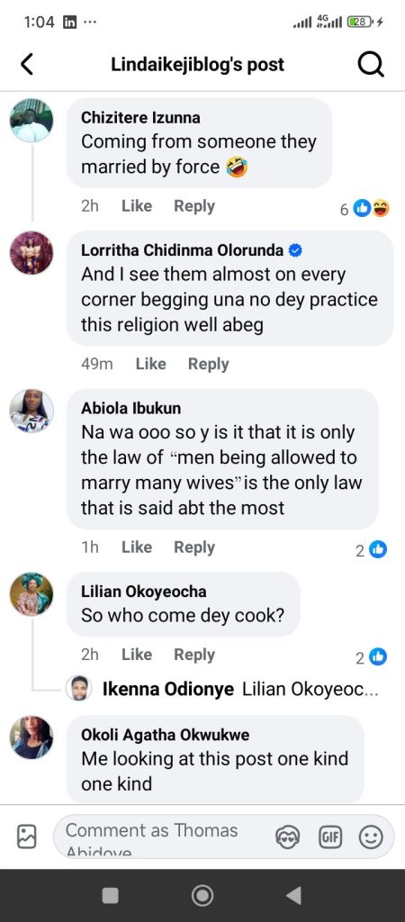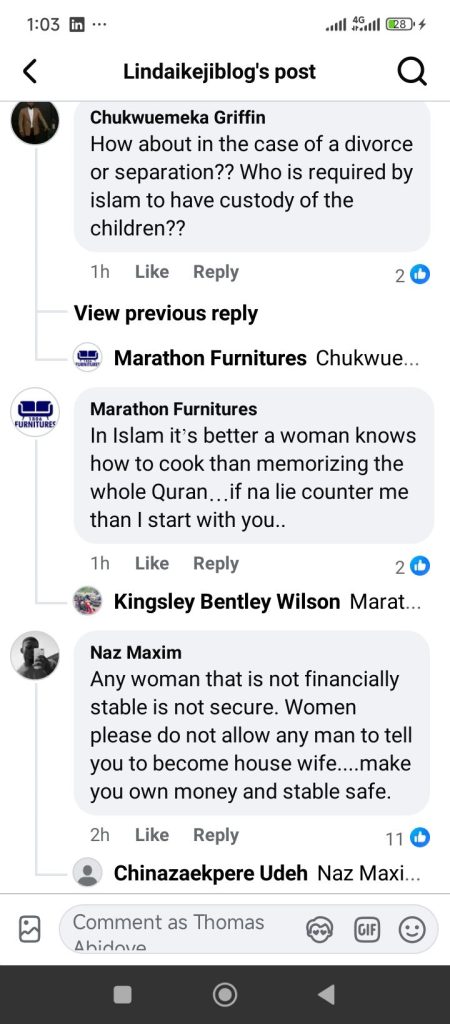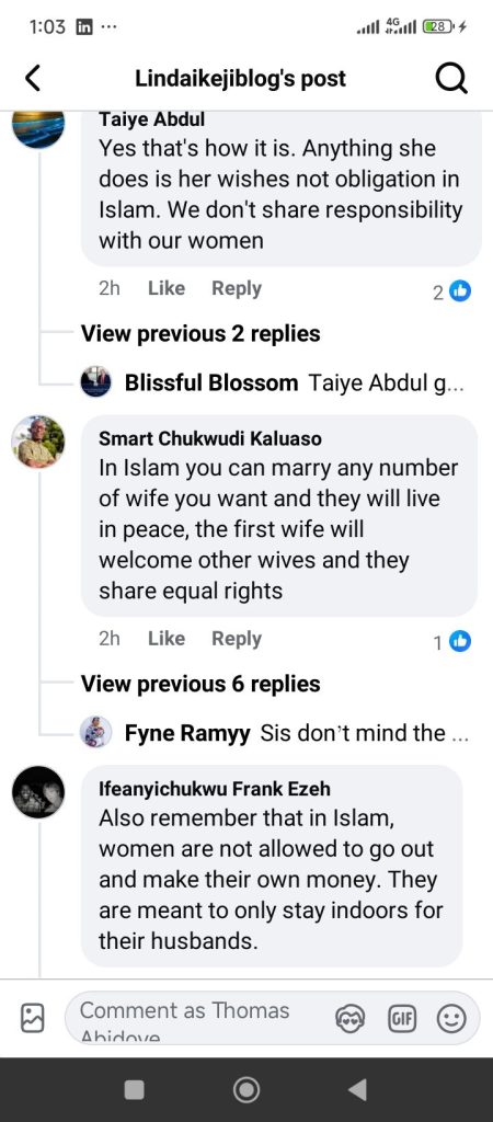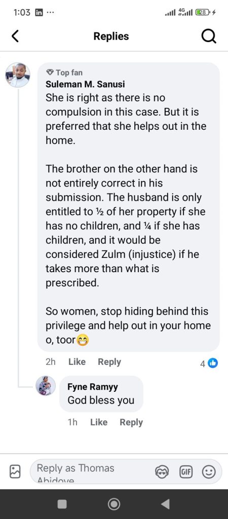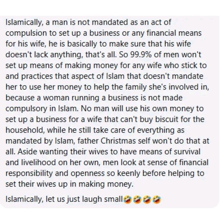 Reacting to her post, one Kasim Yusuf, said that in Islam, a married woman under her husband’s care and protection is not even allowed to do anything to make money, unless with his permission.