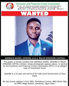 The Economic and Financial Crimes Commission (EFCC) has declared a 24-year-old native of Ori-Ade Local Government of Osun state, Adewale Daniel Jayeoba of Wales Kingdom Capital Limited wanted in an alleged case of investment scam.