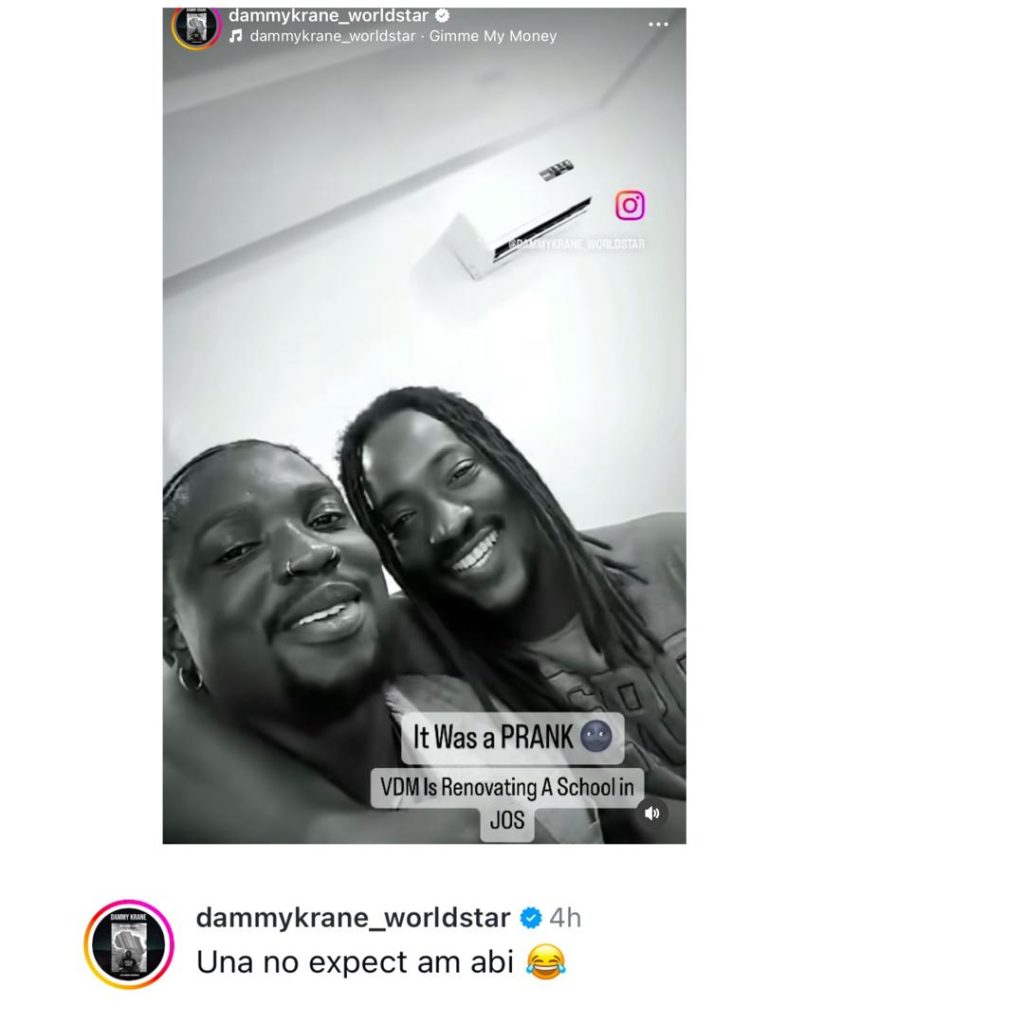 However, in a post shared on his Instagram page this evening, Dammy Krane claimed that VDM is renovating a school in Jos, and was only joking with the story of stolen funds.
