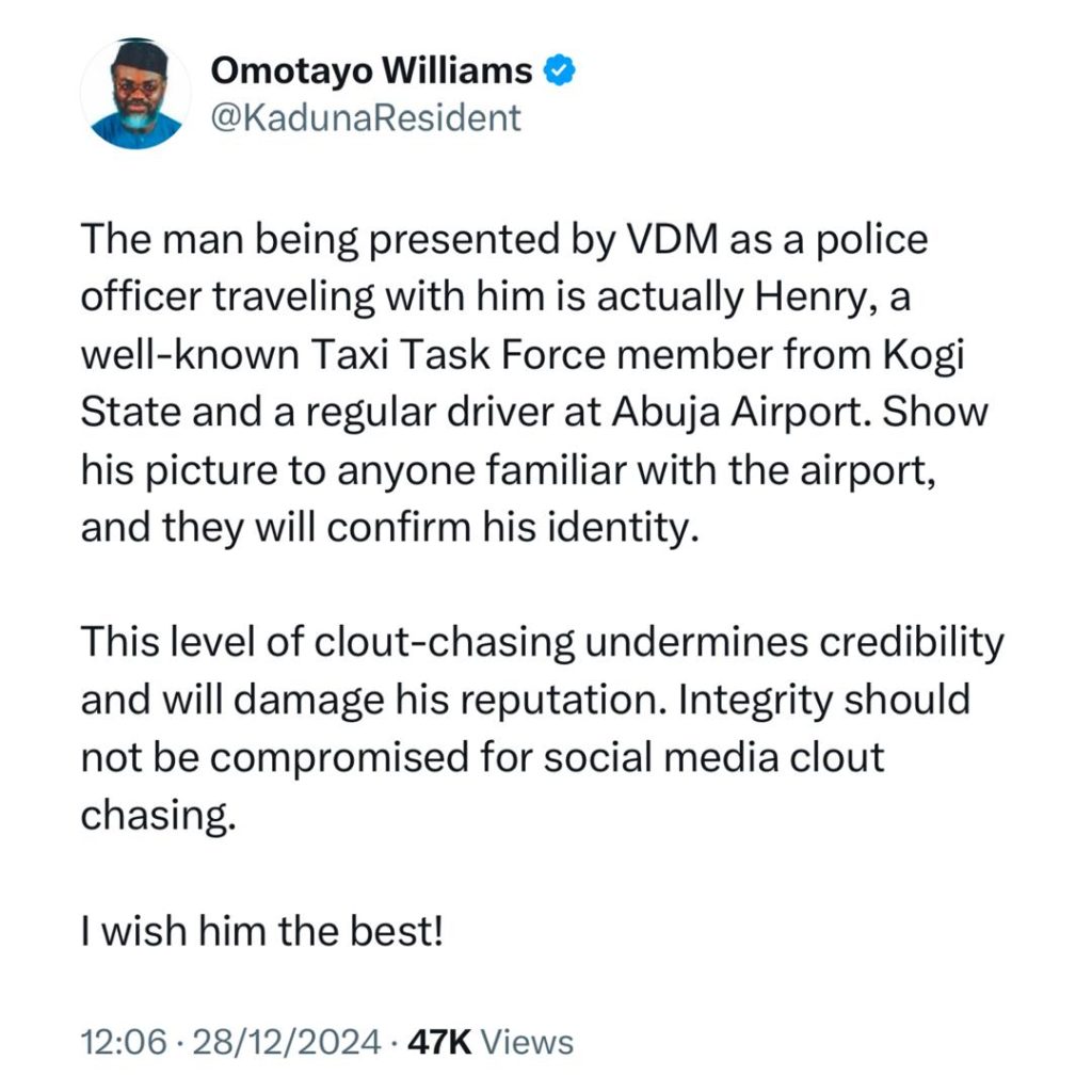 Also, a Human Rights activist, Omotayo Williams, claimed the man VDM showed in his video as an officer accompanying him to Jos is a well-known member of the Kogi State Taxi Taskforce.