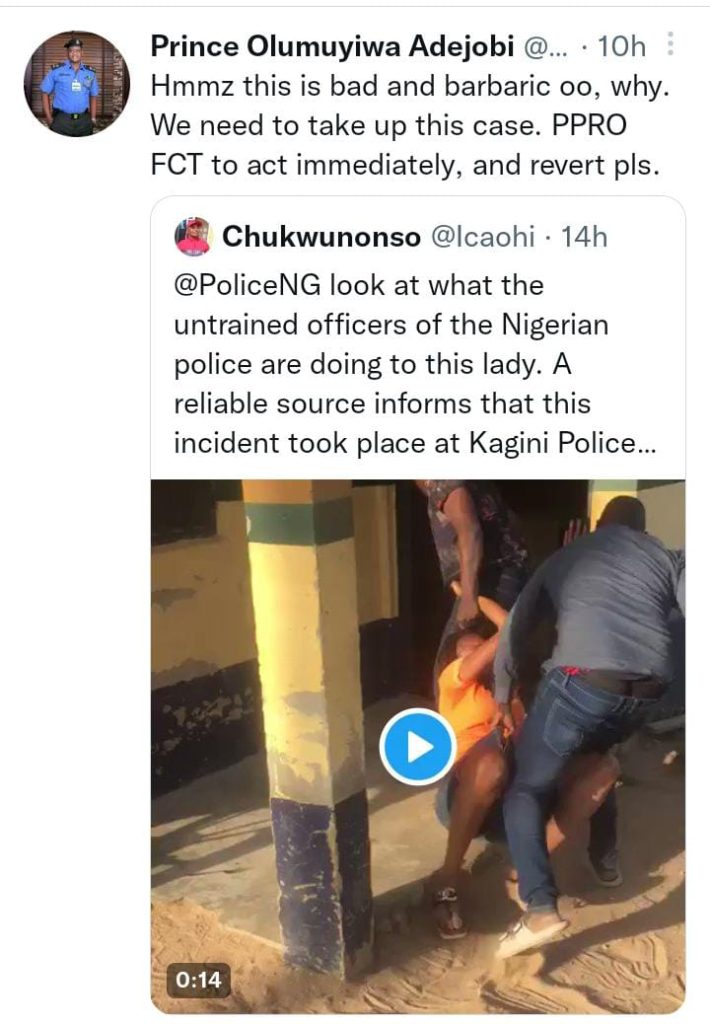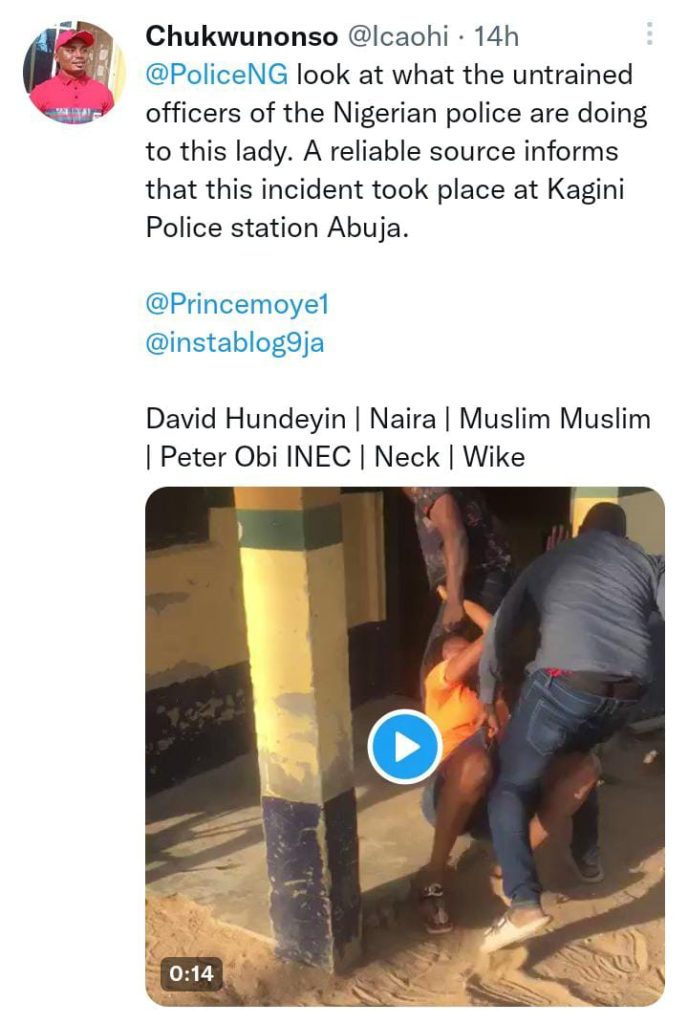 ”@PoliceNG look at what the untrained officers of the Nigerian police are doing to this lady. A reliable source informs that this incident took place at Kagini Police station Abuja.” the Twitter user wrote