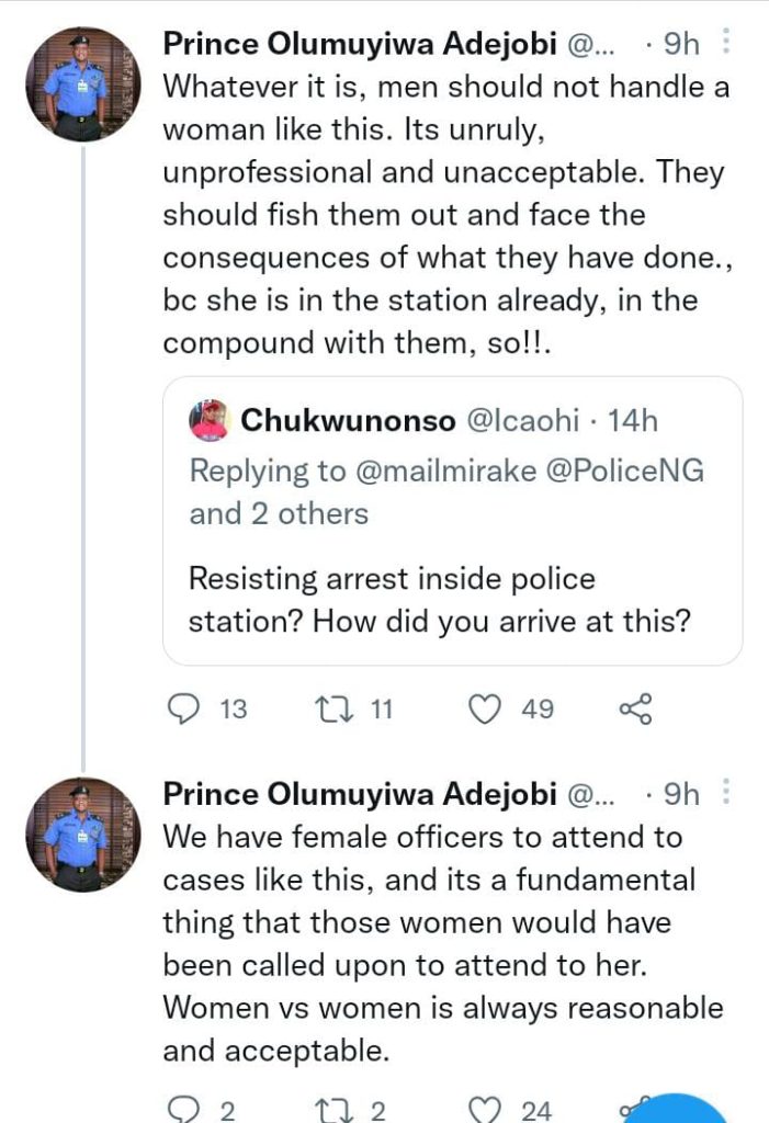 The spokesperson of the Nigeria Police Force, CSP OLumuyiwa Adejobi, has condemned the actions of some officers who were filmed manhandling a woman inside a police station.