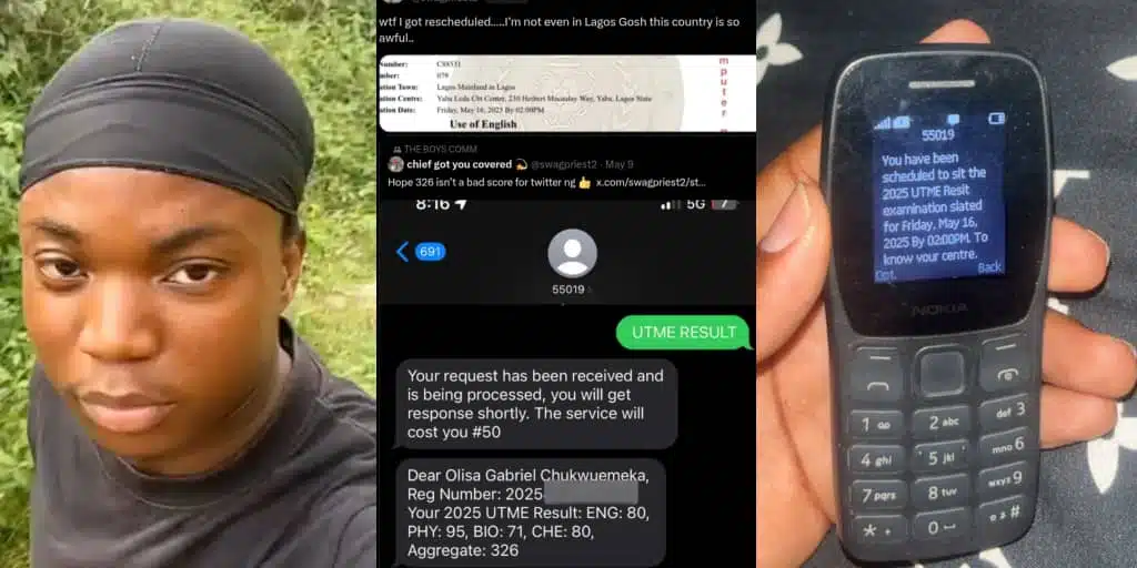 A JAMB candidate who scored 326 in his UTME exam has shared a message he received from the examination body, notifying him that he has been rescheduled to retake the test.