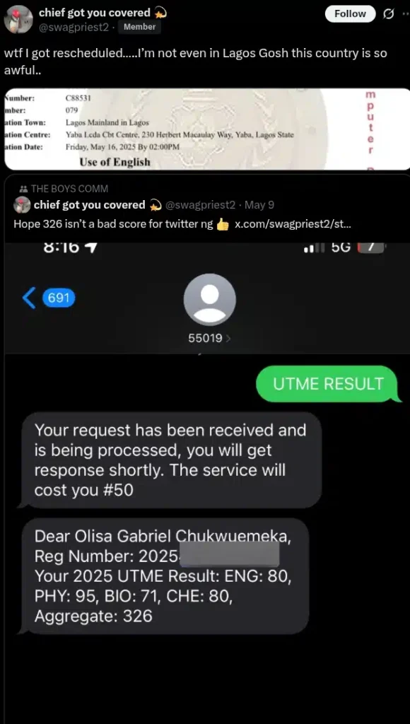 In his latest update, @swagpriest2 shared a screenshot of the SMS he received and wrote: “WTF I got rescheduled… I’m not even in Lagos. Gosh, this country is so awful.”