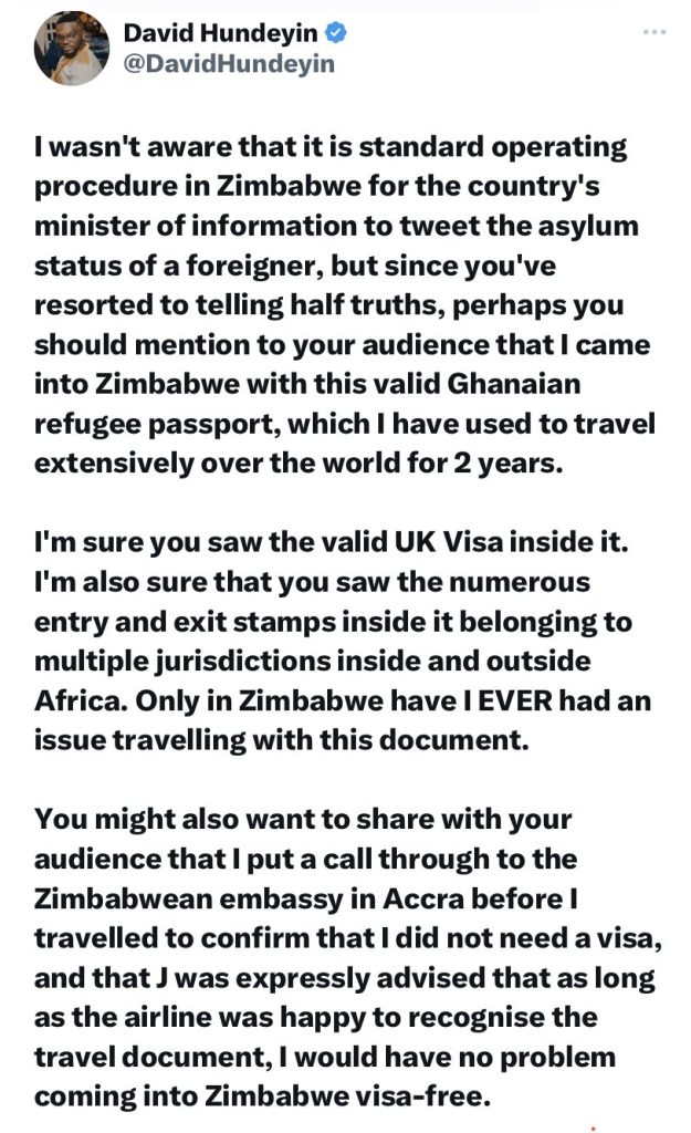 A Zimbabwean journalist, Hopewell Chin’ono, sent a Tweet message to Mangwana asking that the authorities release Hundeyin as his arrest does not do the image of their country well. In his response, Mangwana defended the decision of the Zimbabwean government saying that the laws of their country are no respecter of any person. He went further to reveal that Hundeyin came into their country with ‘Ghanaian Refuge Papers as he was claiming to be running away from his country. He said the Ghanaian Refuge Papers’ requires a visa.