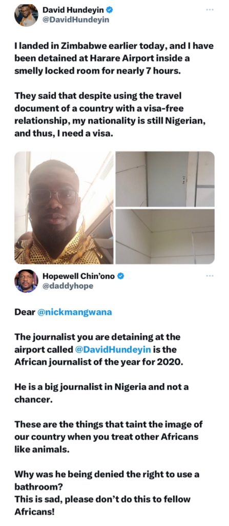 Journalist, David Hundeyin, and the Permanent Secretary of Information, Publicity and Broadcasting Service, Nick Mangwana, clashed on Twitter earlier today following his detention at the Harare International Airport in Zimbabwe on Wednesday, July 19.
