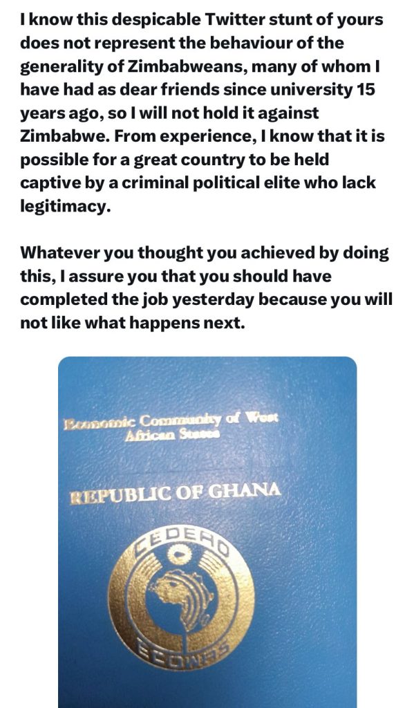 Hundeyin in his defense said that he inquired from the Zimbabwean embassy in Ghana if he required a visa and he was told he didn’t. He did not hesitate to express his displeasure that Mangwana put out his personal information on social media.