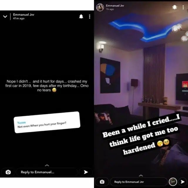 Emmanuel revealed that it’s been a while he cried and his recent near-death experience has rendered him emotional.