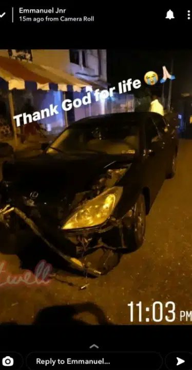 Emmanuel posted the picture of his badly damaged car while thanking God for sparing his life. He made this post on his social media page.