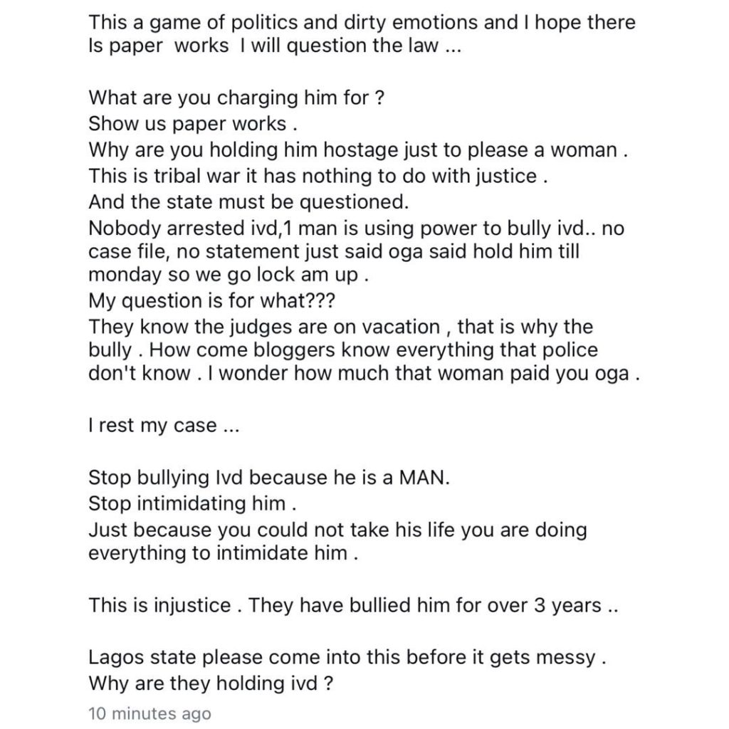In a statement released on her Instagram page this afternoon, Blessing argued that IVD is being bullied and intimidated. She said that there was no court directive banning him from travelling as he would never have even made his travel plans public if there was.