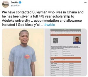 Giving an update on the search, he said, ” We have contacted Suleyman who lives in Ghana and he has been given a full 4/5 year scholarship to Adeleke University.. accomodation and allowance Included ! God bless y’all..#wrblo