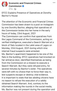 It read, “The attention of the Economic and Financial Crimes Commission has been drawn to a post on Instagram by one Dorothy Bachor, alleging that operatives of the Commission broke into her home in the early hours of today, 23rd August 2021