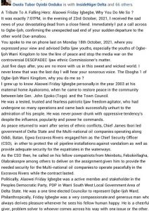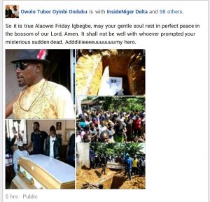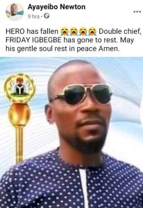 In his confirmed Facebook handle, fellow comrades across Ijaw land mourned Igbegbe, whom they described as a king-hearted, goal-getting ‘double chief.’