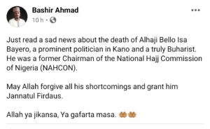 “Just read a sad news about the death of Alhaji Bello Isa Bayero, a prominent politician in Kano and a truly Buharist. He was a former Chairman of the National Hajj Commission of Nigeria (NAHCON).