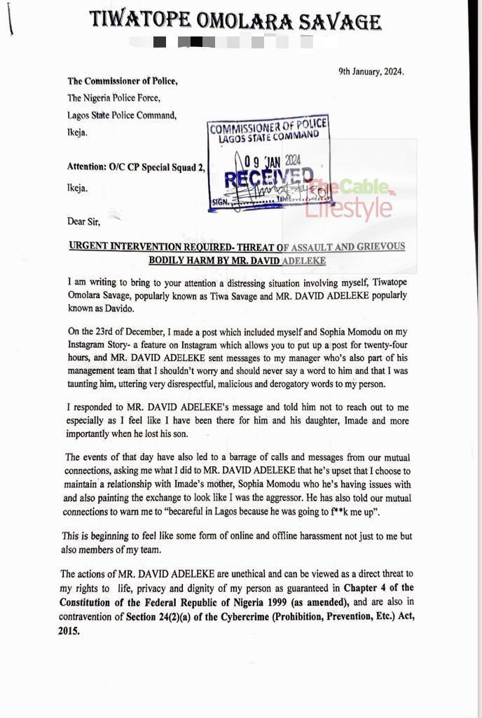 The ongoing matter between Tiwa Savage and Davido might be a very long one as singer Tiwa Savage petitioned the Commissioner of Police against Davido. The petition is dated today January 9th 2024.
