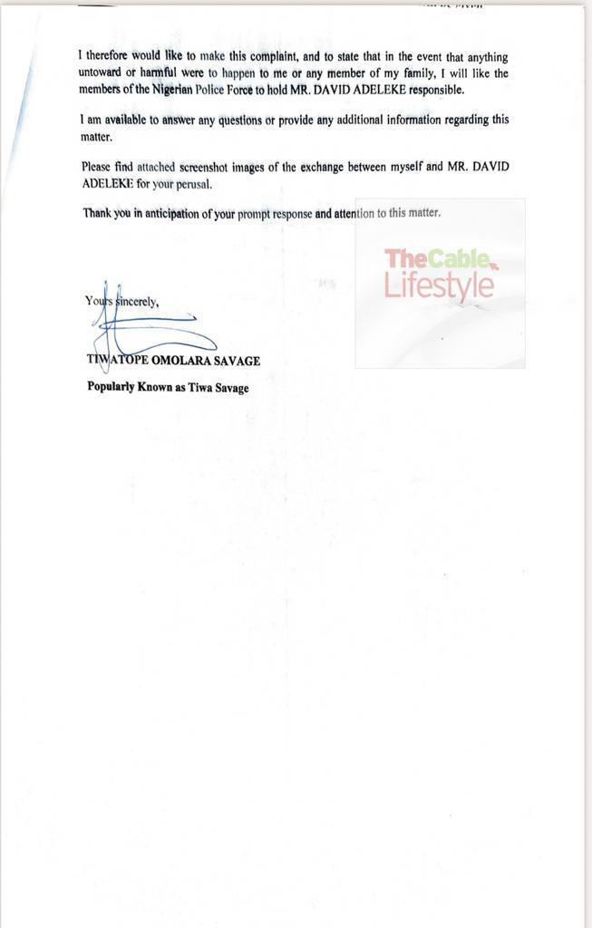 I therefore would like to make this complaint, and to state that in the event that anything untoward or harmful were to happen to me or any member of my family, I will like the members of the Nigerian Police Force to hold MR. DAVID ADELEKE responsible.