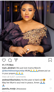 While sharing a picture of Nkechi Blessing, Abraham wrote, “We just lost @nkechiblessingsunday mum 🙏 🙏🙏. Please put us in your prayers 🙏🙏🙏🙏.