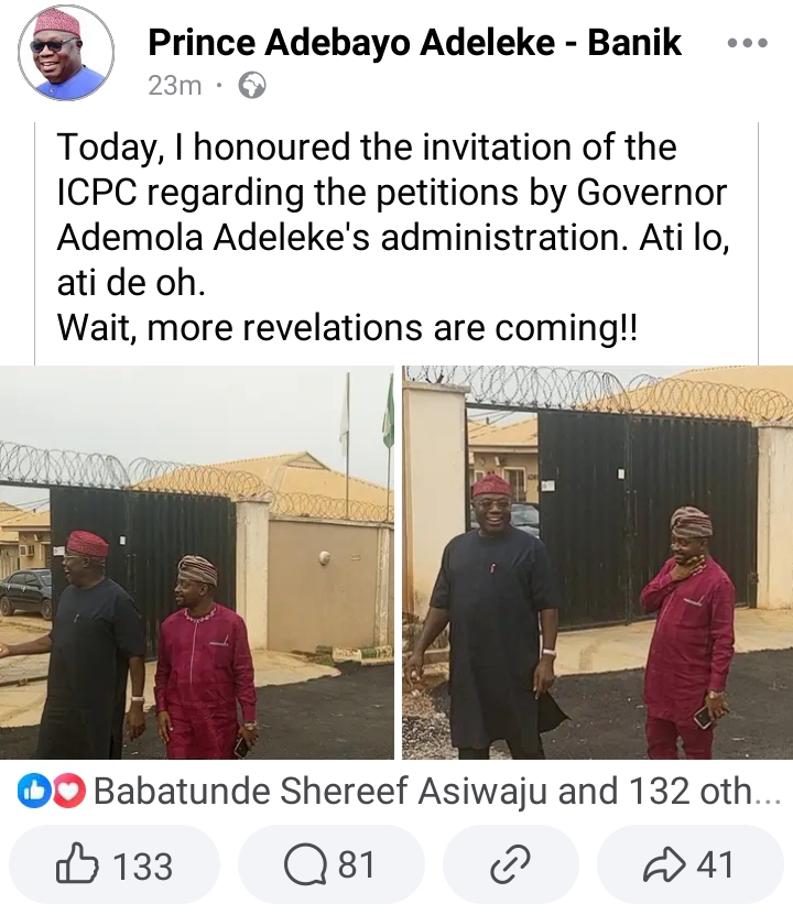 He wrote: “Today, I honoured the invitation of the ICPC regarding the petitions by Governor Ademola Adeleke’s administration. Ati lo, ati de oh. Wait, more revelations are coming!!”.
