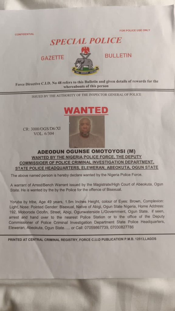 The bulletin stated that Omotoyosi, a 49-year-old native of Abigi in Ogun Waterside Local Government Area, is wanted in connection with allegations relating to his sexuality.