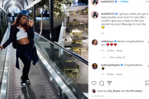 Teebillz who already has four children with three other women, made the announcement by sharing a photo of his partner flashing her baby bump.