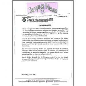 According to a news publication released by the school today June 2, the lecturers’ dismissal was approved by the Governing Council of the University on May 31 and took effect on the same day.