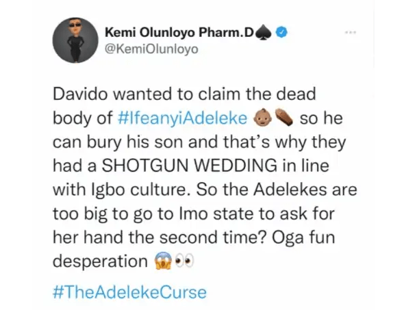 Kemi who has been ranting for days about The Adeleke’s Curse, took to Twitter to reveal the main reason why Davido married Chioma. According to her, Davido married Chioma to claim the dead body of his son. This is in accordance to the customs and Traditions of Igbo land that a child belongs to the father only if the marriage rites, Bride price have been paid.