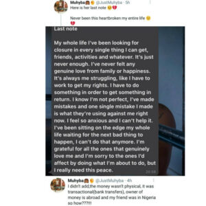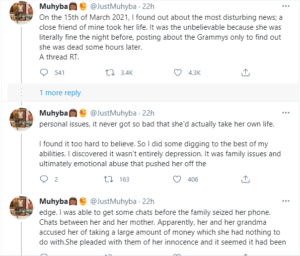 ”On the 15th of March 2021, I found out about the most disturbing news; a close friend of mine took her life. It was the unbelievable because she was literally fine the night before, posting about the Grammys only to find out she was dead some hours later.
