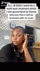 The injury however turned to dark scars weeks after. She added that they asked her to return for another treatment but she refused and is now requesting for a refund.
