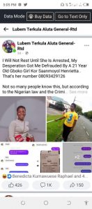 According to the post, Terkula transferred N1,500 to Henrietta through POS to enable her visit him in Makurdi. Terkula said she waited for the lady for a while but she failed to show up, he called her countless times but she failed to pickup.