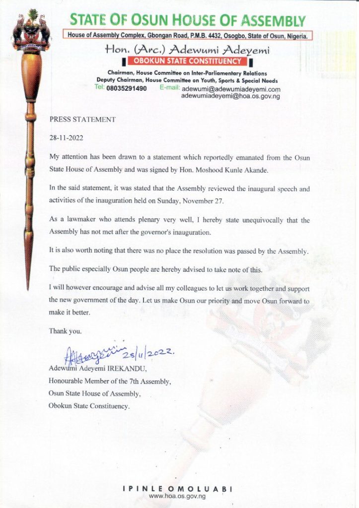 The lawmaker representing Obokun State Constituency in the State of Osun House of Assembly, Hon. Adewumi Adeyemi has denounced a statement from the parliament, reviewing the inaugural speech of Governor Ademola Adeleke.