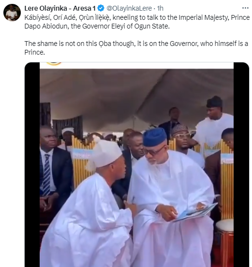 A former media aide to ex-governor, Ayo Fayose, Lere Olayinka, has tackled the governor of Ogun state, Dapo Abiodun, for allowing a king to squat just to speak to him.