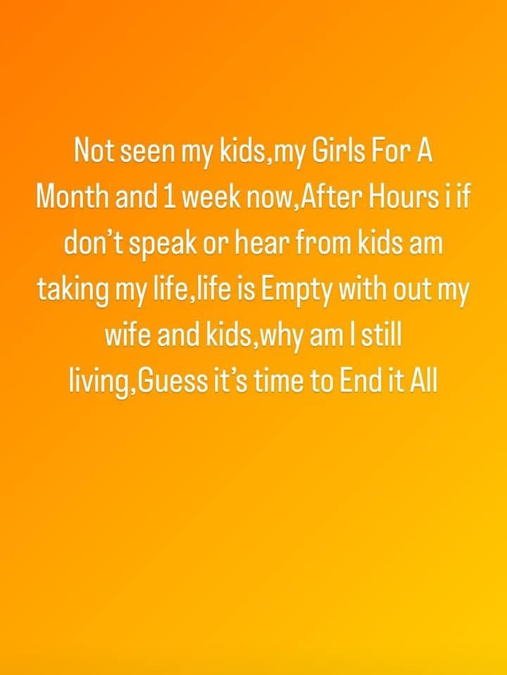 “Not seen my kids, my Girls for a month and 1 week now, after hours if I don’t speak or hear from kids am taking my life. My life is empty without my wife and kids, why am I still living, it’s time to End it all”.