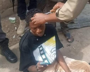 A photo that has angered Nigerians online shows Amoka using a pair of scissors to cut the young man’s hair after making him sit on the bare floor.