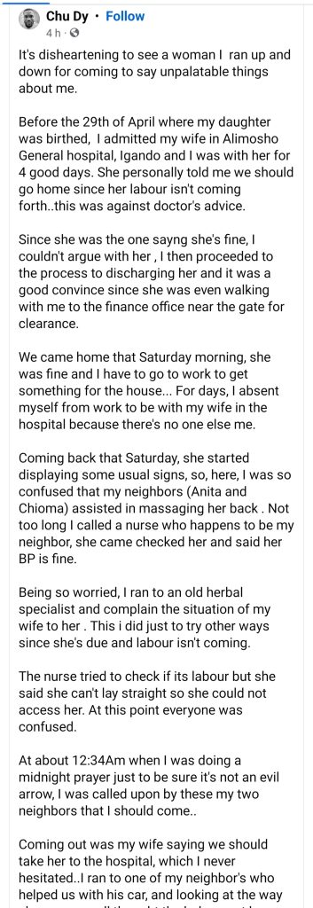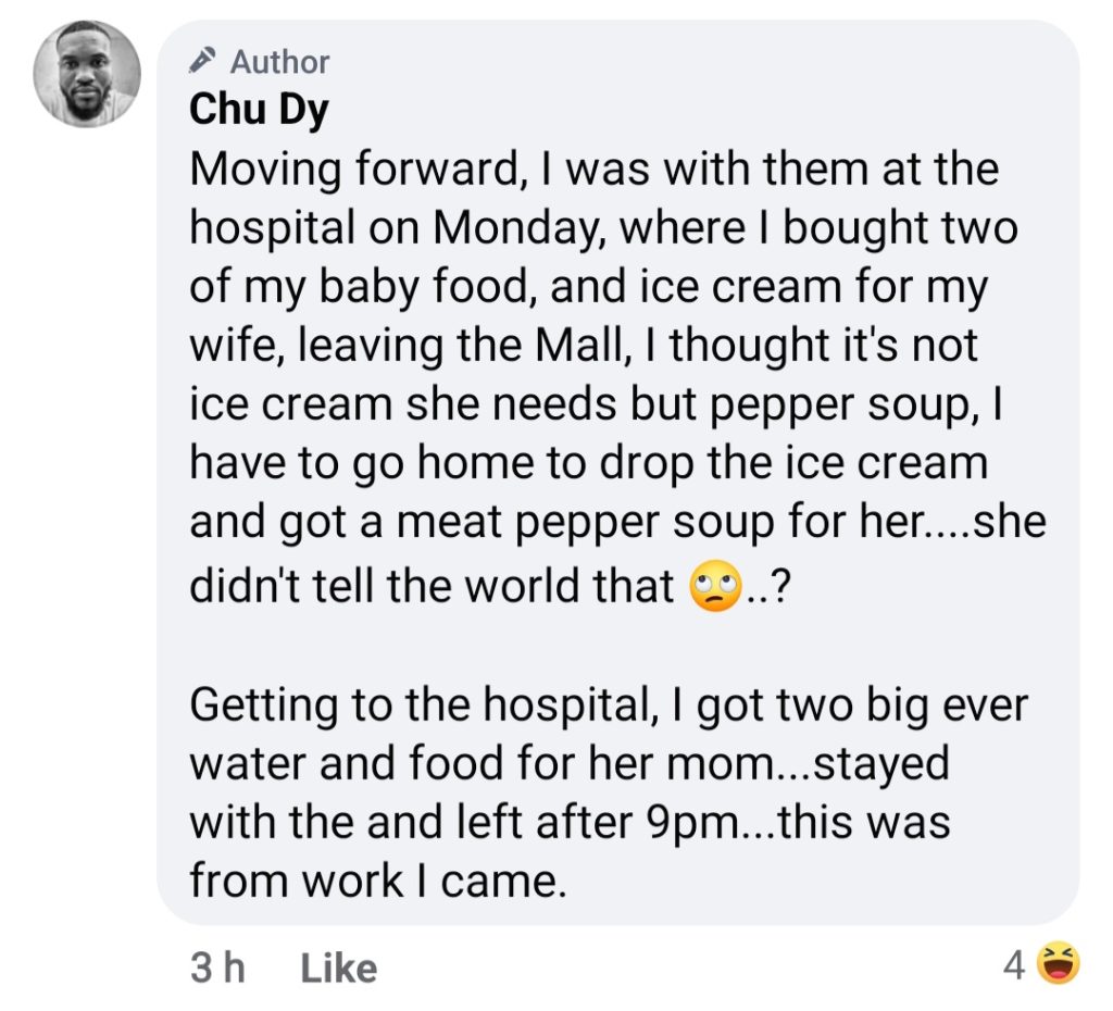 He wrote: “Since the very minutes Obol Jesam Michael came to our rescue, my wife started displaying caprices that she can shout at me to the extent nurses and some patient have to beg me to ignore her. If you know my wife closely, you should know the kind of person she is.”