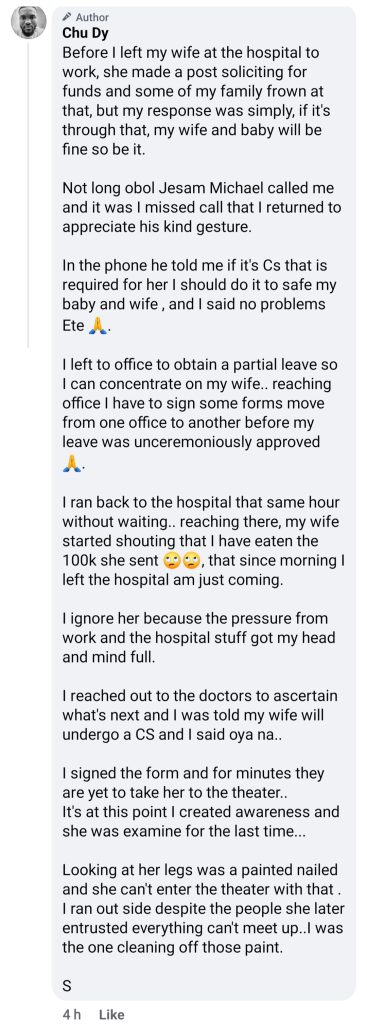 When her situation escalated, she said she returned to the hospital then gave her husband N240k out of the money donated by the kind-hearted man on Facebook to pay for the CS.