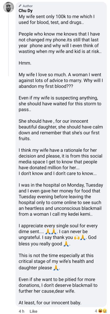 He said his wife’s behaviour changed the moment the kind Facebook user donated a huge sum to her for their child’s birth.