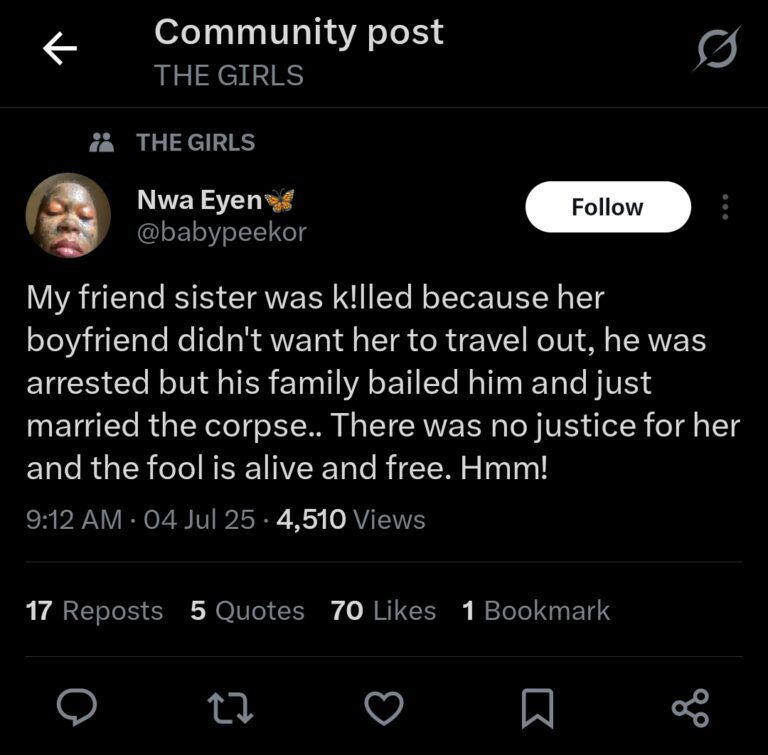 “My friend’s sister was killed because her boyfriend didn’t want her to travel out. He was arrested, but his family bailed him and just married the corpse. There was no justice for her, and the fool is alive and free. Hmm!” the post read.