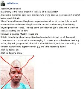 Meanwhile a Facebook user, Nafiu Romo also took to the platform to call for Isah’s arrest.