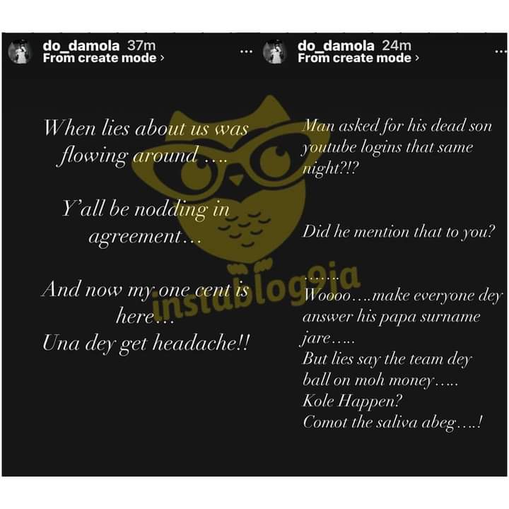 In a series of posts shared on his Instastories, Damola claimed the late Mohbad’s father demanded the login details to Mohbad’s YouTube page the night he passed away on September 12, 2023.