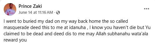 “I went to bury my dad. On my way back home, the so called masquerade did this to me at idanuha. I know you haven’t d!ed but you claimed to be dead and did this to me. may Allah subhanahu wata’ala reward you,” he wrote.