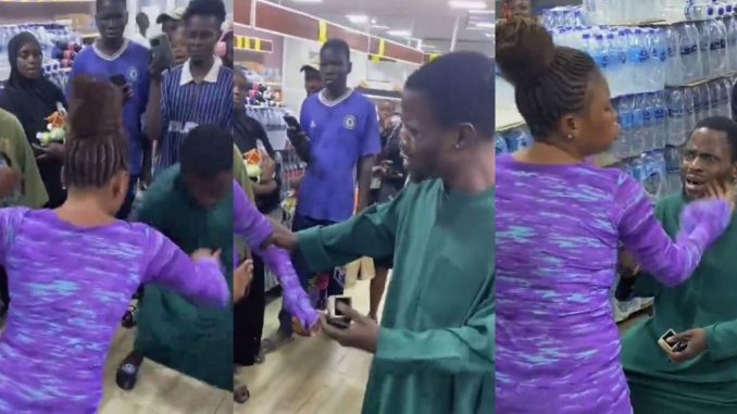 The incident was captured in a video that later went viral on X (formerly Twitter). The clip shows the man going down on one knee in the middle of a busy supermarket aisle, holding a ring as shoppers watched and recorded the scene.