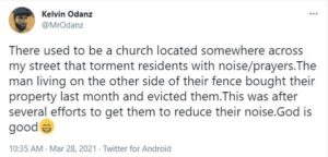 A Twitter user, @MrOdanz has taken to the platform to narrate how a wealthy neighbour bought a church building, and kicked out all its members over noise pollution.