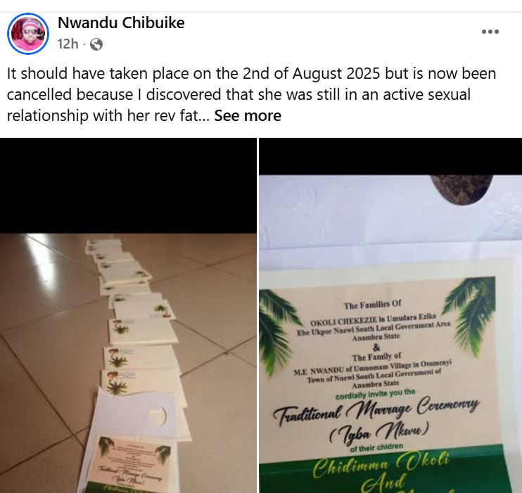 A Nigerian man, Nwandu Chibuike, has publicly announced the cancellation of his planned wedding after discovering that his fiancée was allegedly involved in an ongoing s3xual relationship with her reverend father.