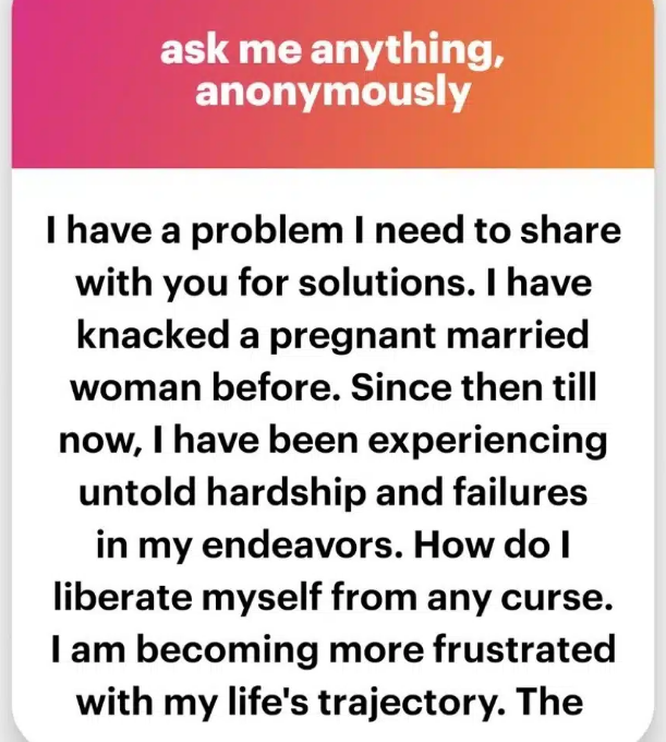 In his words; “I have a problem I need to share with you for solutions. I have knacked a pregnant married woman before. Since then till now, I have been experiencing untold hardship and failures in my endeavors. How do I liberate myself from any curse.I am becoming more frustrated with my life’s trajectory.”